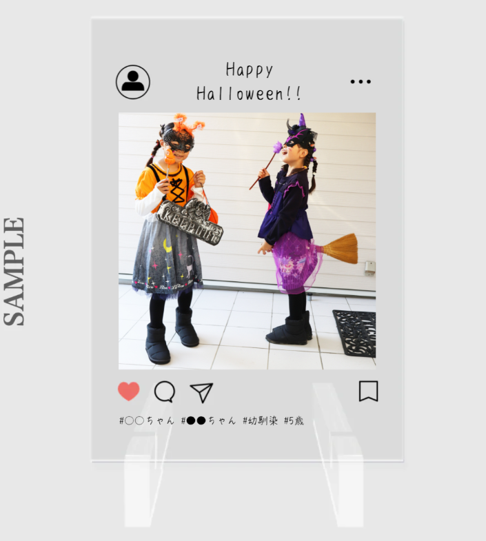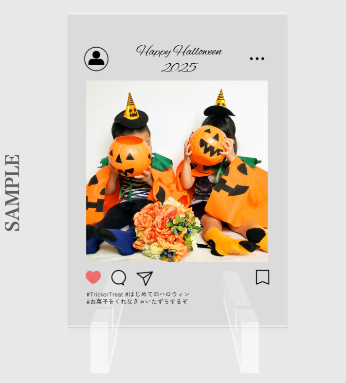 ハロウィンの楽しい思い出にぴったりな、ユニークでおしゃれなデザインのインスタ風アクリルフォトフレーム。透明感の高いアクリルに、まるでInstagramの投稿画面のように写真とタイトル、ハッシュタグをプリント。世界にひとつの、オリジナルなフォトフレームになります!