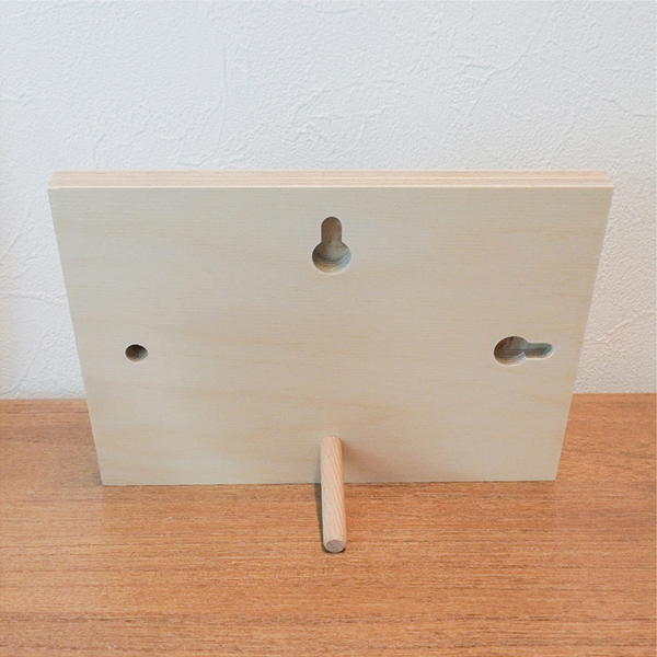 木製フォトブロックの裏面には、立てかけ用のスタンドと壁掛け用の穴が付いています。