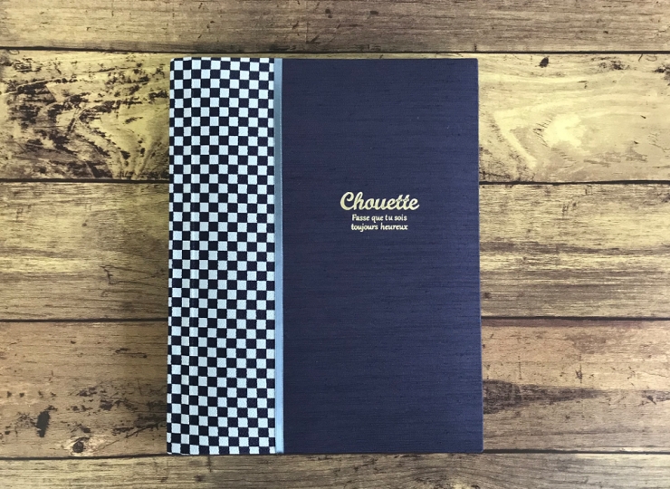 こちらのフォトアルバムは、古典的な市松柄のちりめん生地に麻生地を合わせて、モダンにデザインしました。