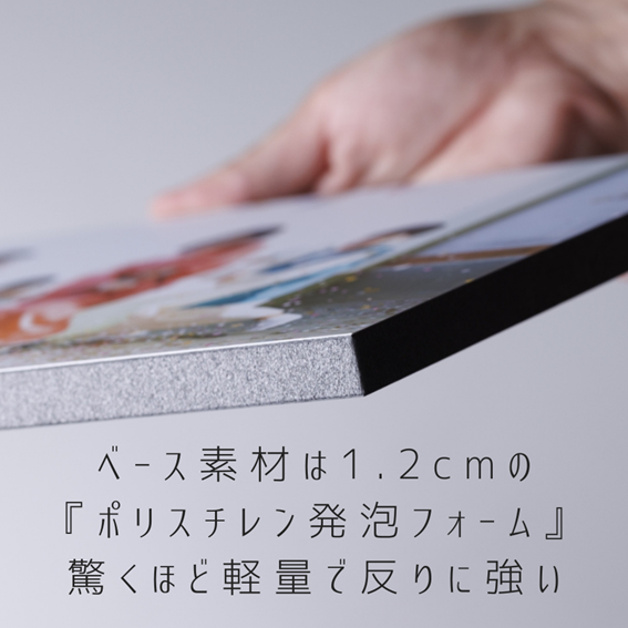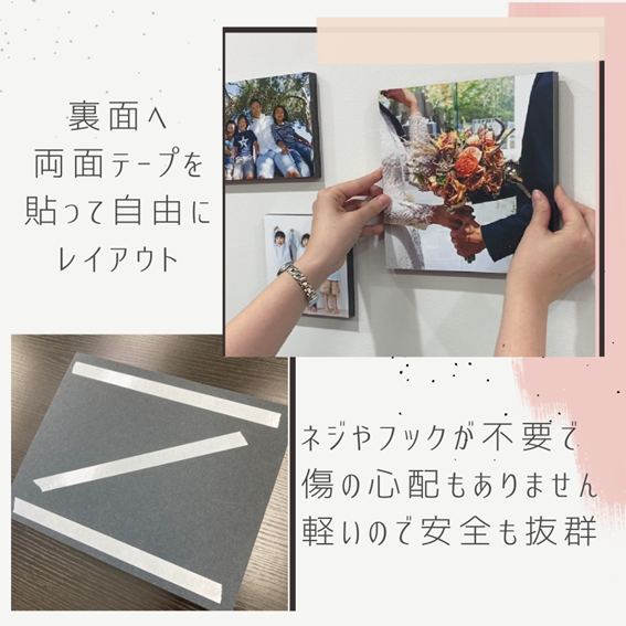 一般的な額縁だと「重いから、しっかり固定しなきゃ……」と身構えてしまいますが、かるパネは特殊なポリスチレン発泡フォームを使用した軽量フォトパネルなんです。