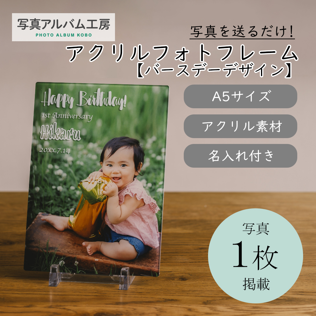 <名入れあり>立体風文字入りアクリルフォトフレーム【A5】バースデイデザイン 写真立て プリント込 写真を送るだけ! アクリルスタンド付き Z7